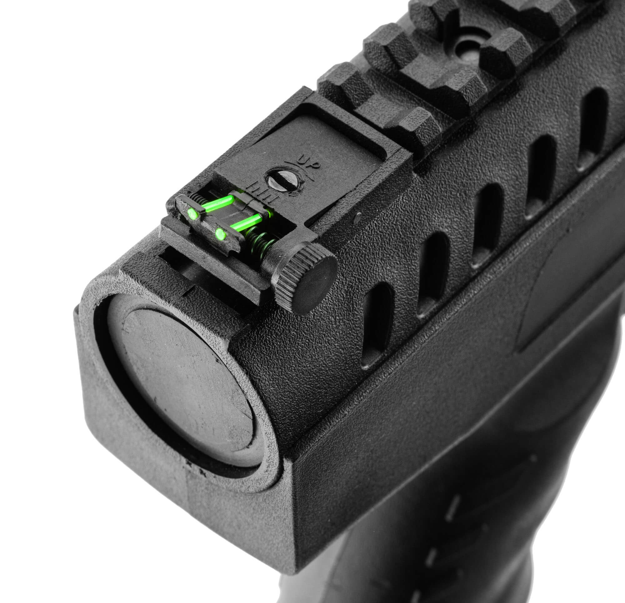The air pistol is broken as you know from other air pistols and rifles. It comes with a fiber optic sight, which makes it a little more comfortable to aim. In addition, there is a Picatinny mount on it, on 21 mm, where you can attach a telescopic sight or red dot sight! Please note that airsoft models with a 21 mm base will fit!