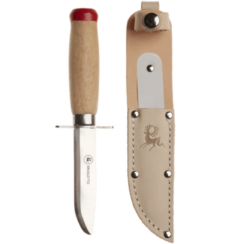 The scout knife with a blunt tip is designed especially for the smallest children. It has a guard grip (finger guard) in front of the blade and a handle that fits both small and large hands. The blade is Scandinavian straight-ground with a blunt tip and is made of 3Cr13 steel, which is easy to sharpen. The handle is varnished wood. The knife comes with a sheath.