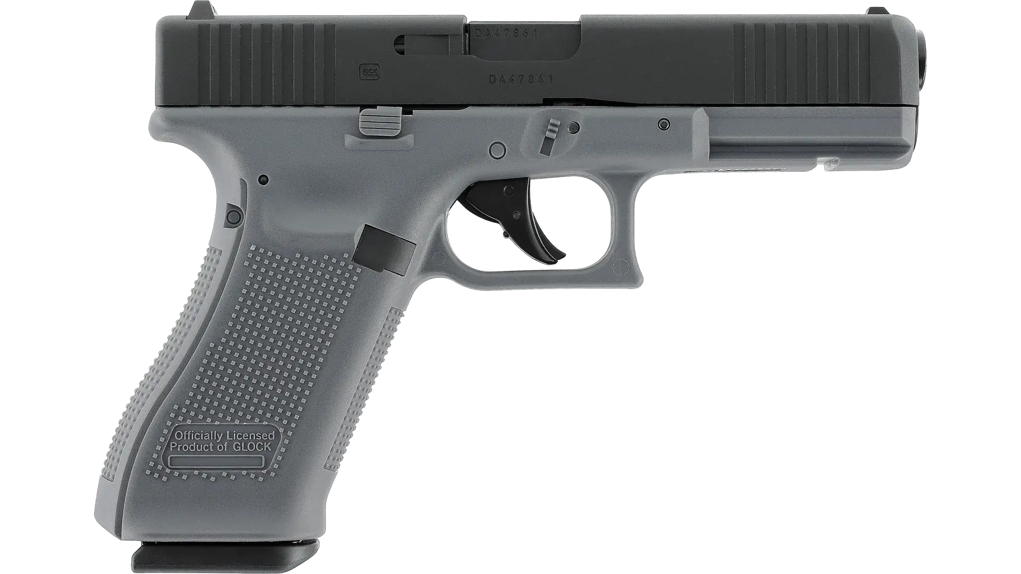 During play, the CO₂-powered airsoft version of the GLOCK 17 Gen5 shows its resemblance to the original. Typical Gen5 features include front serrations, a Weaver rail and a trigger safety. The heavy metal slide and powerful blowback provide an authentic experience. Every shot from the 14-shot All-in-One magazine produces convincing recoil. The precise dimensions and realistic weight ensure perfect handling and full compatibility with standard accessories such as holsters.