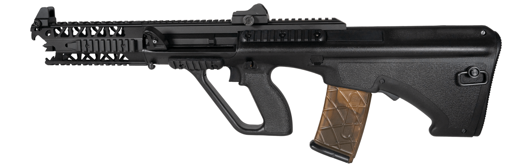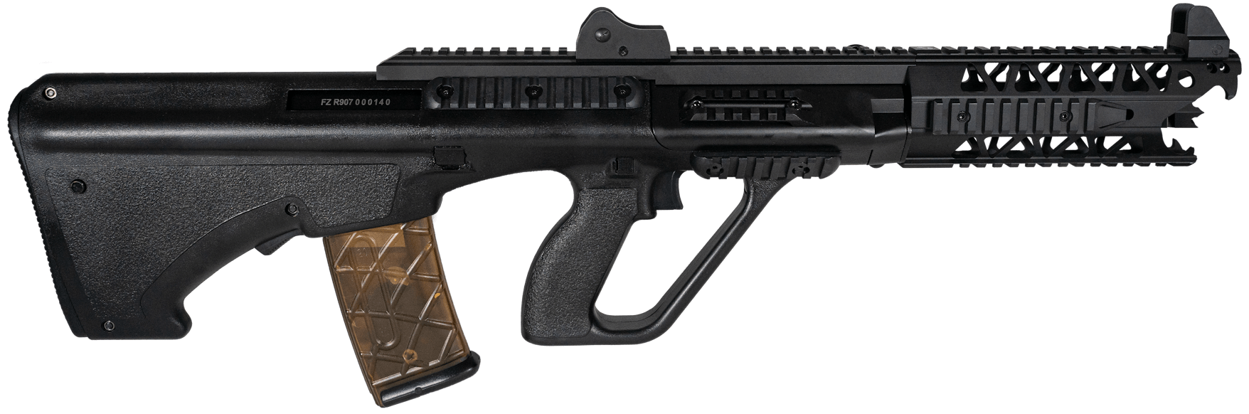 The rifle comes with the characteristic front grip and of course several places with rails so you can mount different equipment.