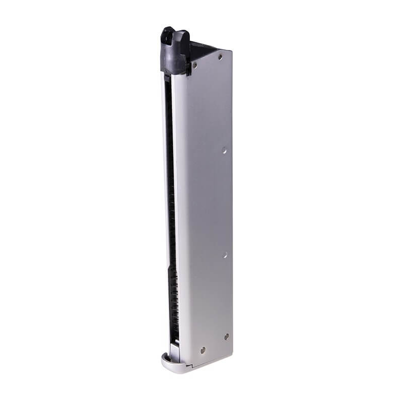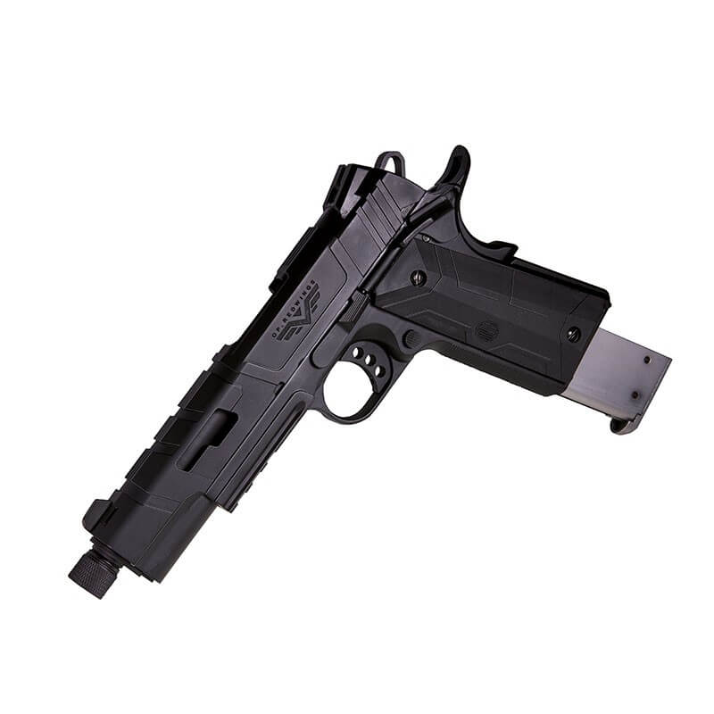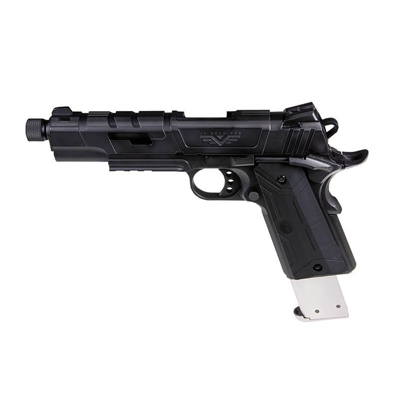 You get a gun with blowback, where the slide moves back and forth like a real gun - In addition, a gun produced in full metal with polymer grip plates. It comes complete with a picatinny rail underneath for e.g. mounting a light and a thread out front for mounting e.g. a silencer if you want this.