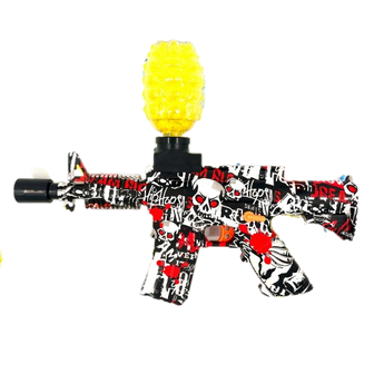The gun here is a mini M4, which has UV-LED light, so the luminescent balls light up! You fill the top of this grenade with gel balls and then it can shoot