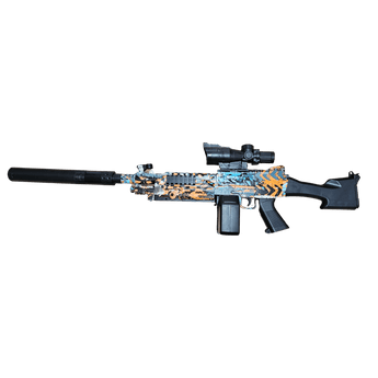 It shoots water beads/gelgun ammo which are small gelatin beads that grow to 7-8 mm in water and can be shot.