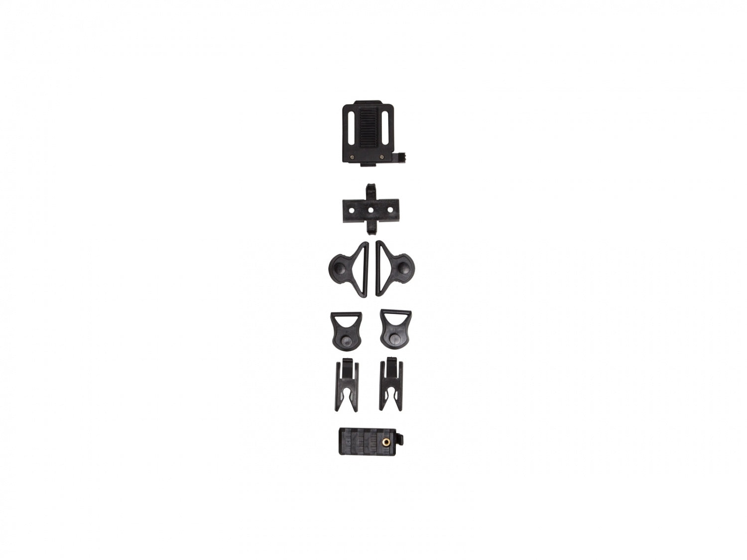 The Strike helmet features many non-snag attachment points for quick mounting of head-worn accessories, such as lights, cameras and goggles. The 4 position Arcs (accessory rail connectors) on the side of the helmet allow for attaching cameras, lights and comms and the NVG bracket at the front has bungees for stability.