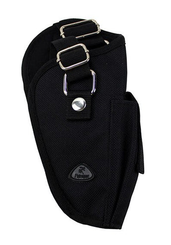 Thigh holster for pistol, right, with leg buckle. There is room for an extra magazine.