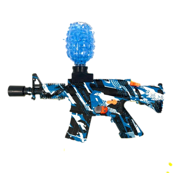 The gun here is a mini M4, which has UV-LED light, so the luminescent balls light up! You fill the top of this grenade with gel balls and then it can shoot