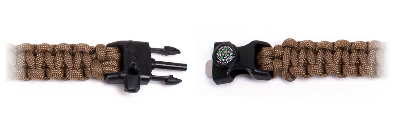 It comes with a buckle that also functions as a compass, whistle and fire starter.