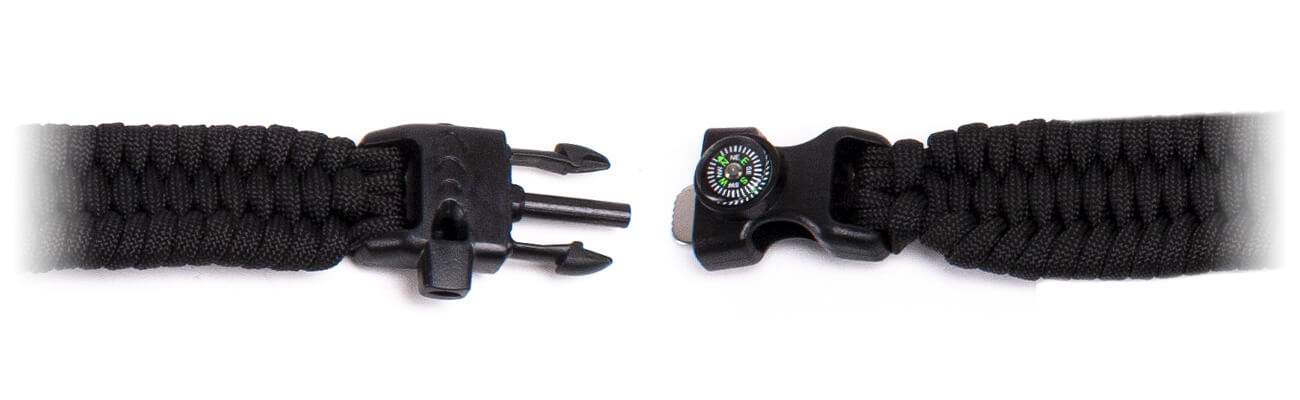 It comes with a buckle that also functions as a compass, whistle and fire starter.