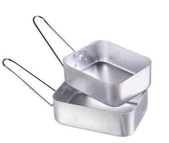 Here we have a mess kit with 2 containers for e.g. food when you are out on a trip. They are both made of aluminum with foldable handles. They are quite robust and are reasonably durable due to the anodized aluminum.