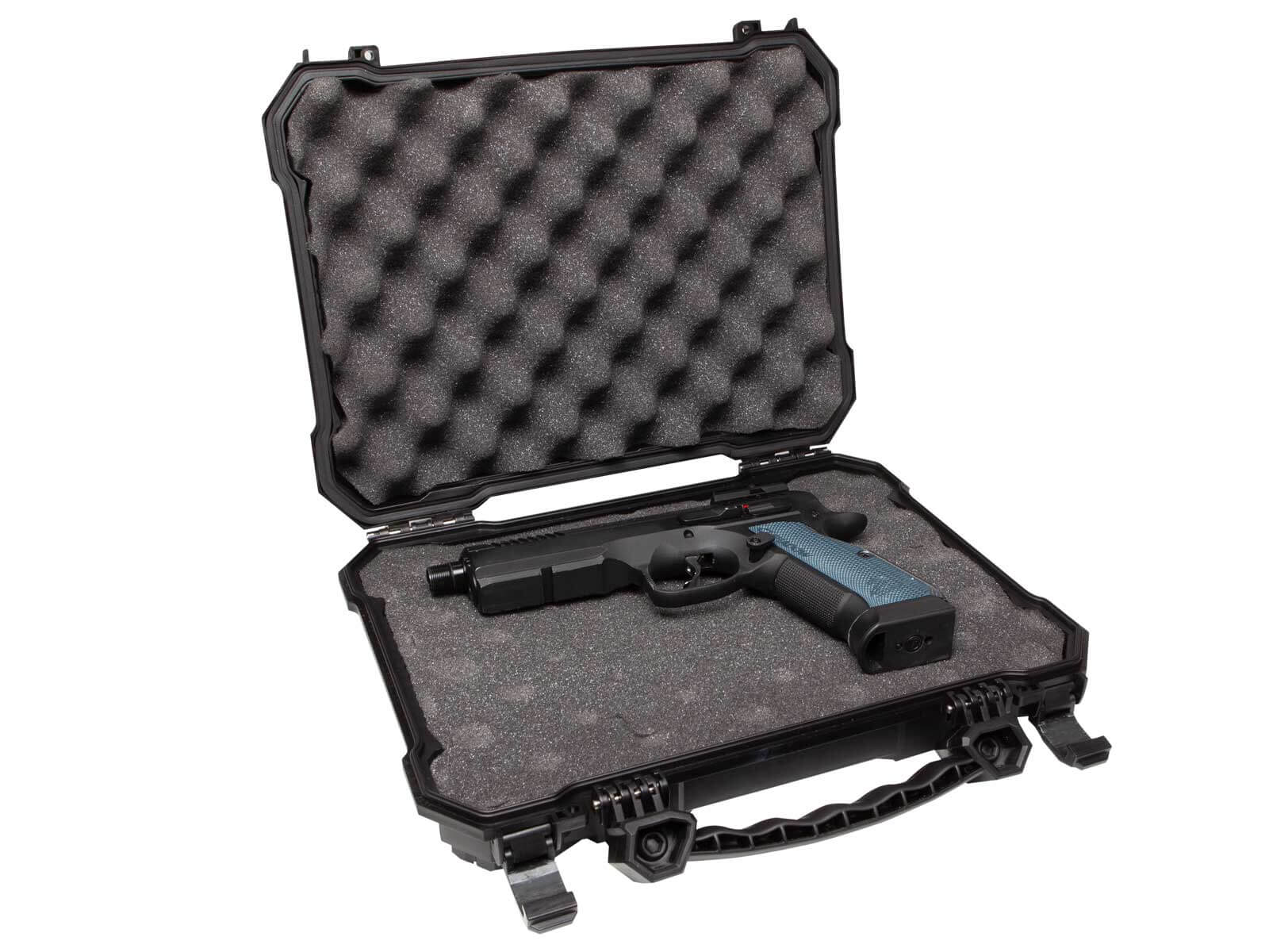 This gun case is the ideal solution for getting your weapon from A to B. It has a reasonable size of 29 x 21 x 6 cm, so you can have pistols/weapons up to 290 mm in length. And when you have a pistol in it, you still have plenty of space for accessories for the pistol.