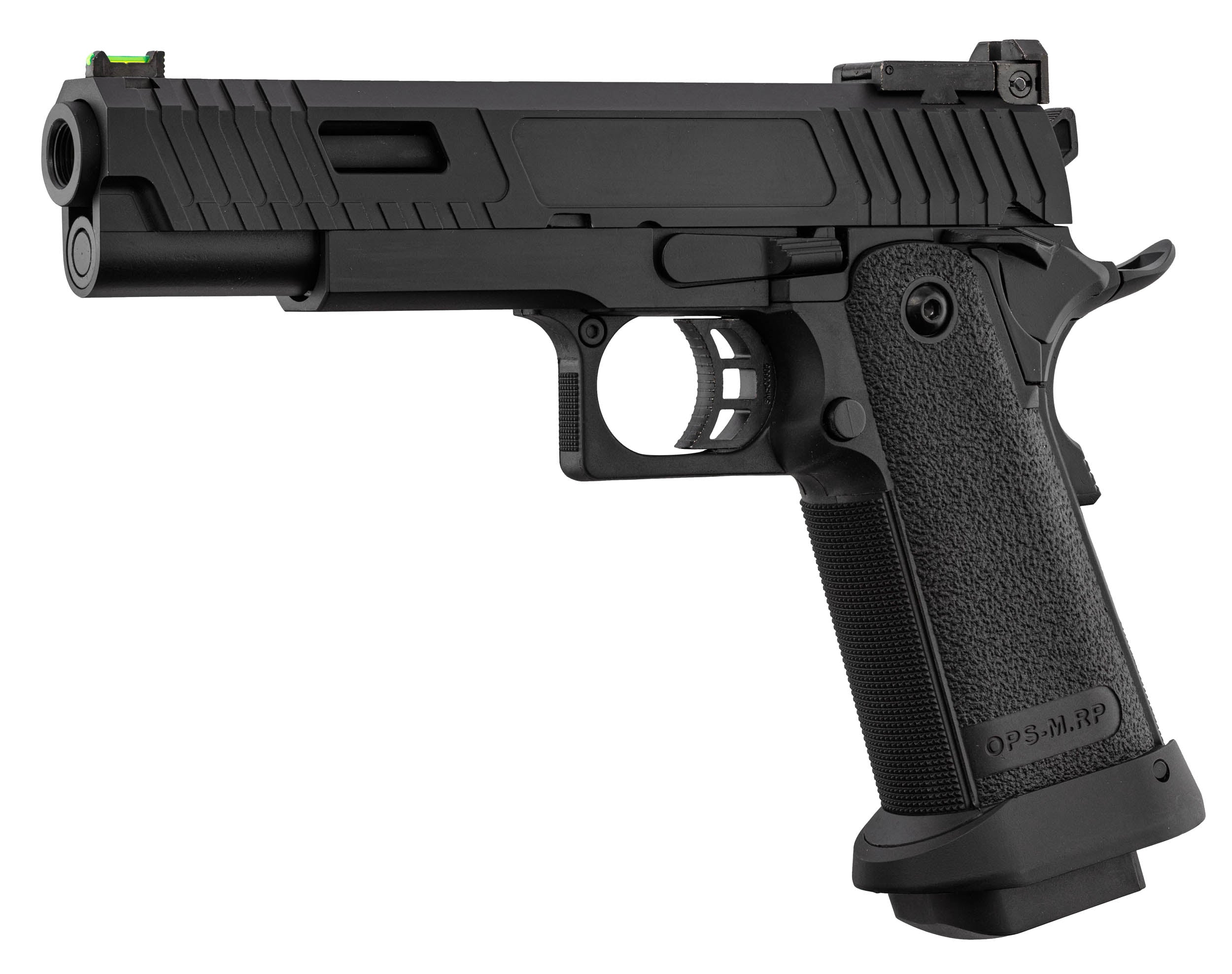 The gun features a fiber optic front sight , textured grip for improved handling, and threaded outer barrel (11mm CW) for mounting a tracer or silencer. Thanks to compatibility with Tokyo Marui Hi-Capa parts, you can easily upgrade and customize the weapon.
