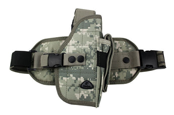 Thigh holster for pistol, right, with leg buckle. There is room for an extra magazine.