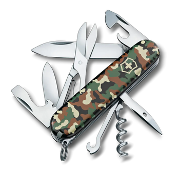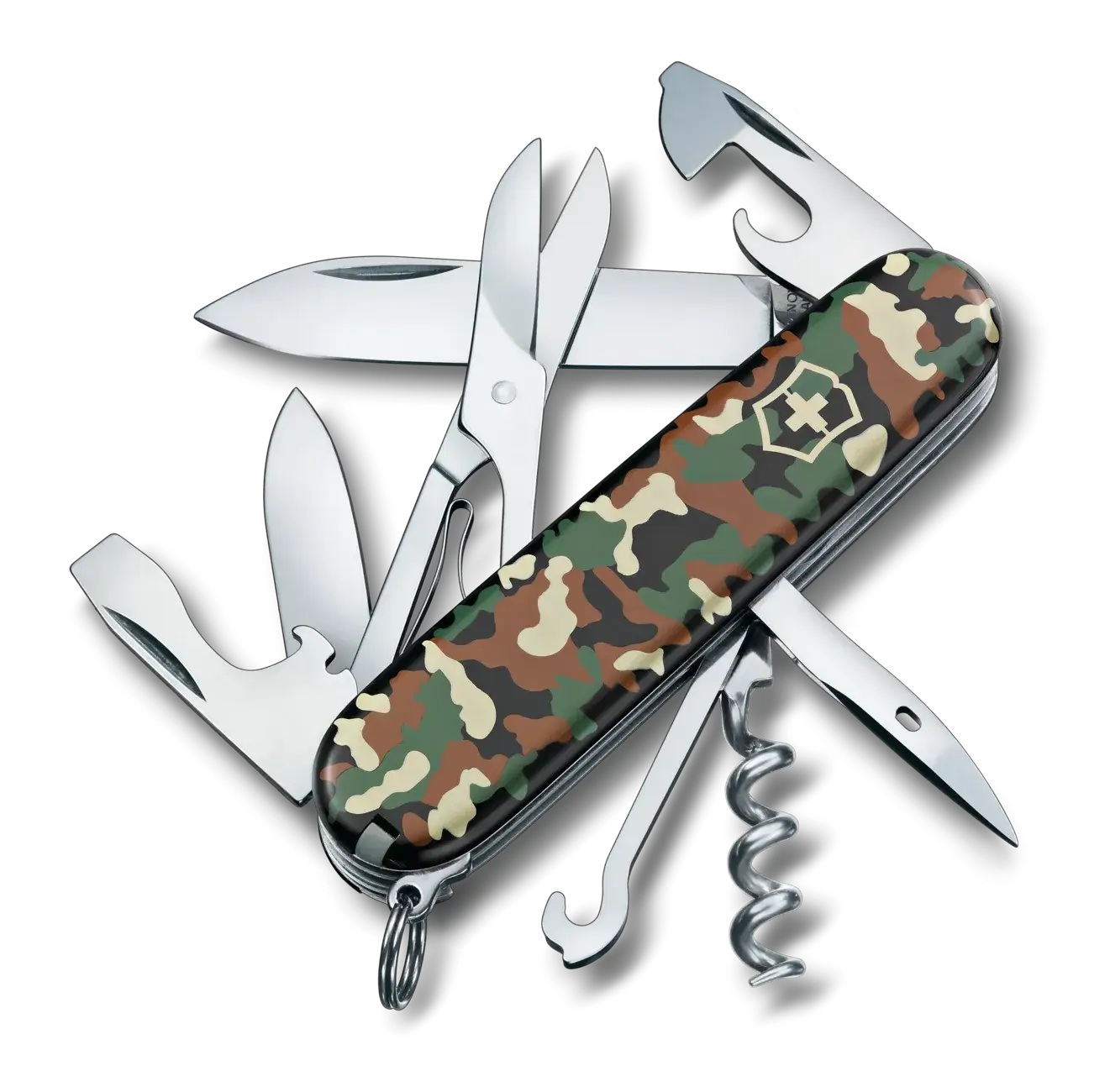 The Victorinox Climber Camo is the perfect pocket knife for adventurers who need a versatile tool in a compact format. With its camouflage pattern, this knife is both stylish and practical, ideal for outdoor activities. It is equipped with 14 functions, including a large and small knife, scissors, can opener, bottle opener, screwdriver and corkscrew. Whether you are camping, hiking or simply need a practical tool for everyday use, the Climber Camo will meet your needs with its quality and reliability.